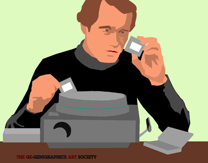 SLIDE GUY LOADING A KODAK CAROUSEL PROJECTOR. Circa 1981. Artist unknown. Graphic illustration from the Genigraphics Reference Guide.