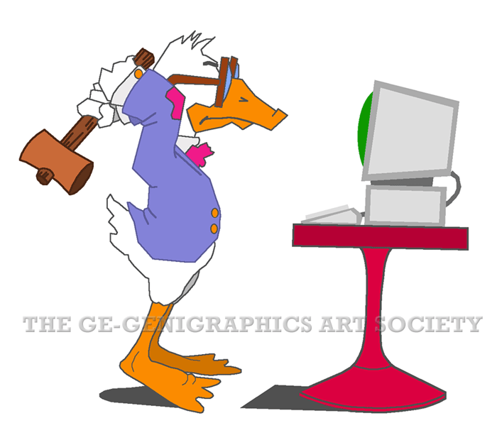 DUCK SMASHING COMPUTER. Based upon an original drawing by Harry Anesta, Art Director, NYC Service Bureau. Graphic illustration from the Genigraphics Reference Guide.