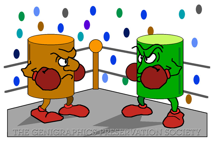 TWO BRANDS FIGHTING IT OUT IN THE RING. Drawn by Abby Weissman. From a series of slides based upon original concept by Harry Anesta, Art Director, NYC Genigraphics Center. Graphic illustration from the Genigraphics Reference Guide.