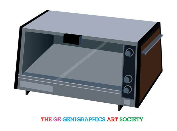 GE TOASTER OVEN, circa 1983. Artist unknown. From the Genigraphics Reference Guide. (Note: this drawing was cleaned up in Adobe Illustrator from original).